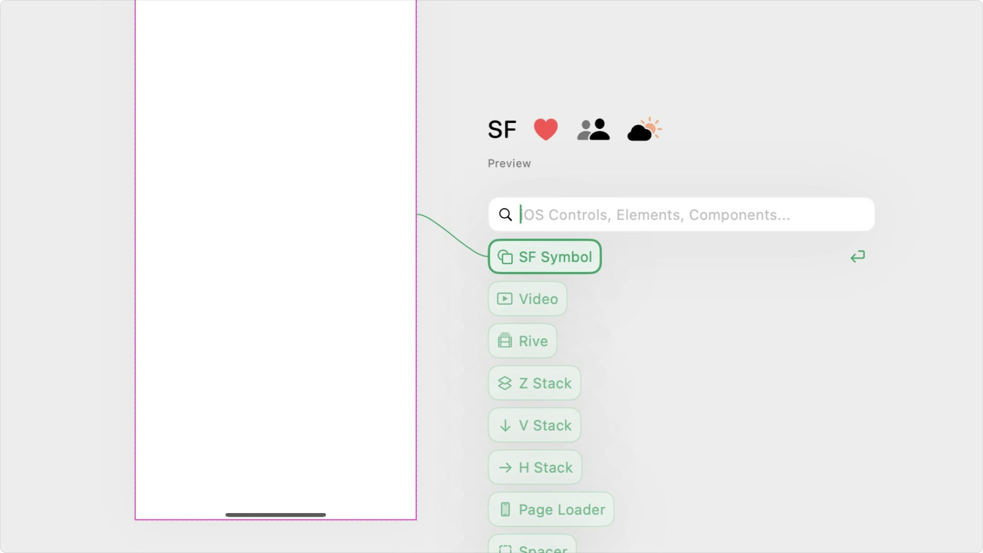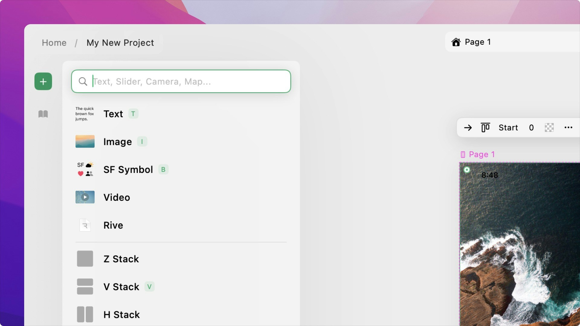 Below the plus icon, you’ll find the book icon which opens the Library. Here you can add components, upload and access assets, and upload fonts. The shortcut OPT + K also opens the library.You can click the green + icon on any non-component container or press the ‘A’ key on your keyboard to open the quick add menu for all objects. You can search, scroll through the options, or use your arrow keys to select an object and press the enter key to add it to your page or stack.