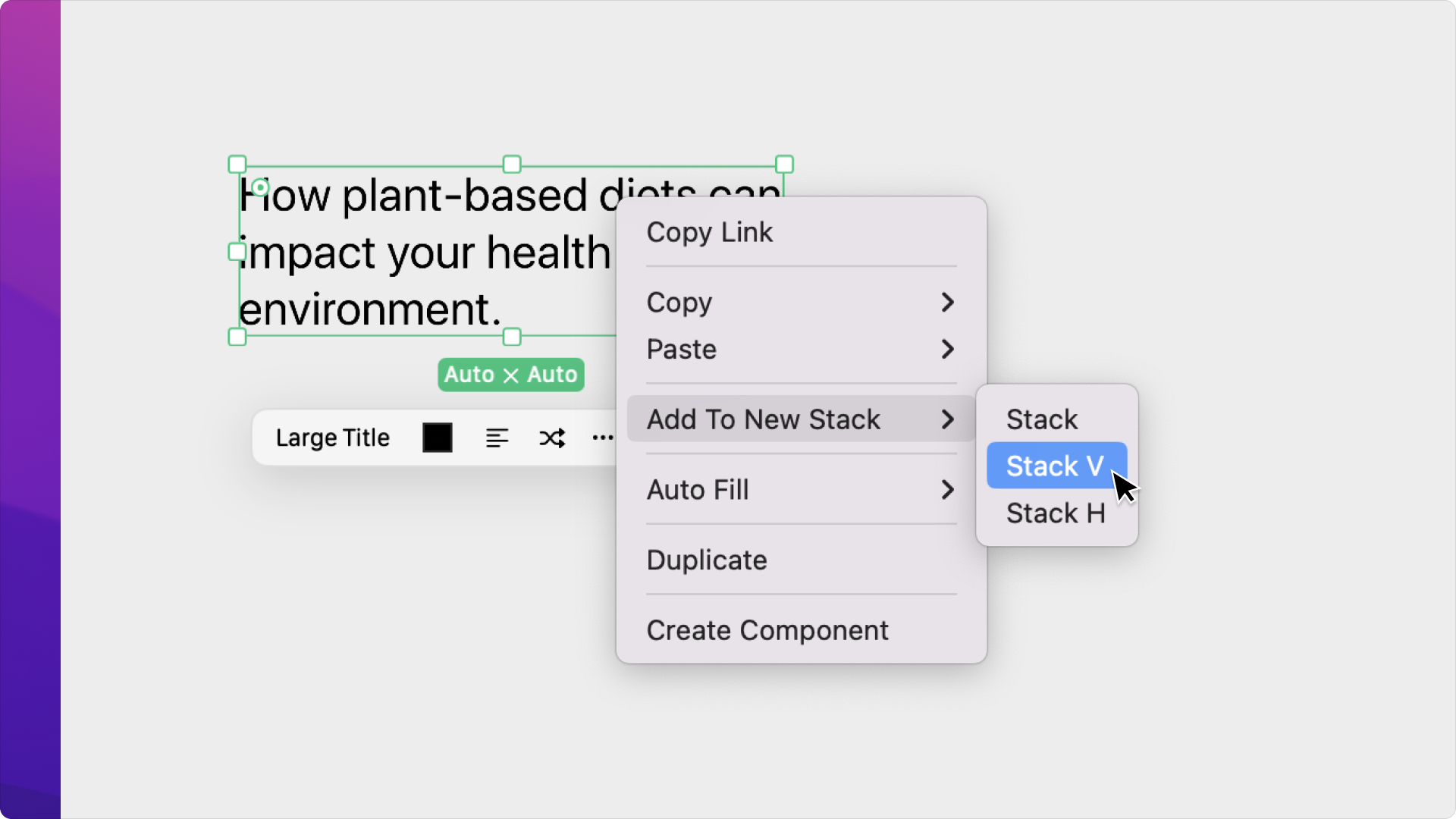 - Add to New Stack - Add the selected object to a V, H, or Z stack. The parent stack will have Auto height and width unless it is a Z stack which cannot have Auto sizing.