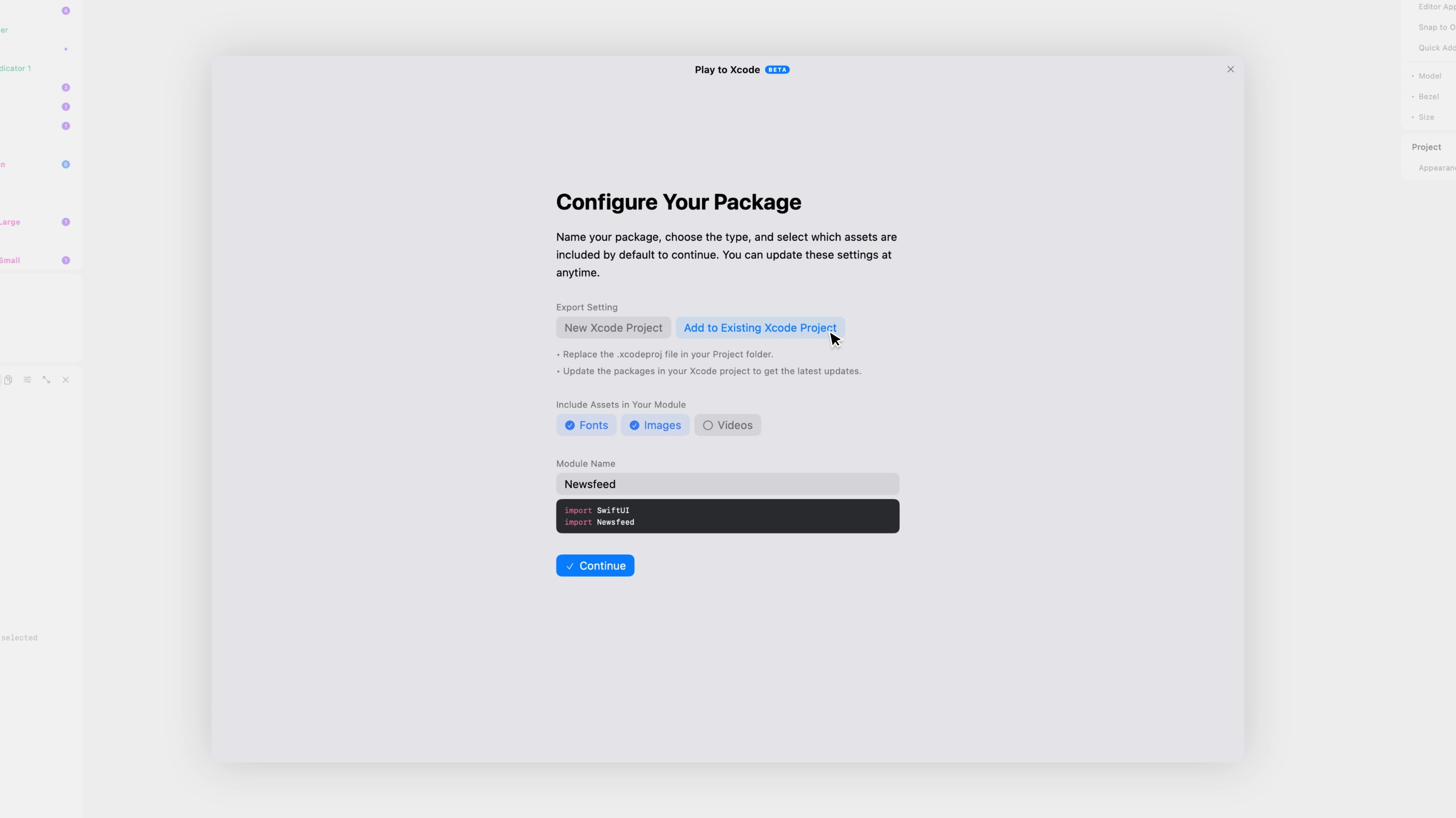 When you’re ready, click “Export to Xcode” to begin the export. You’ll see the download status at the bottom of the macOS app. Select the existing .xcodeproj file to replace. Inside Xcode, update the project the latest package versions from the top menu (File > Packages > Update to Latest Package Versions).