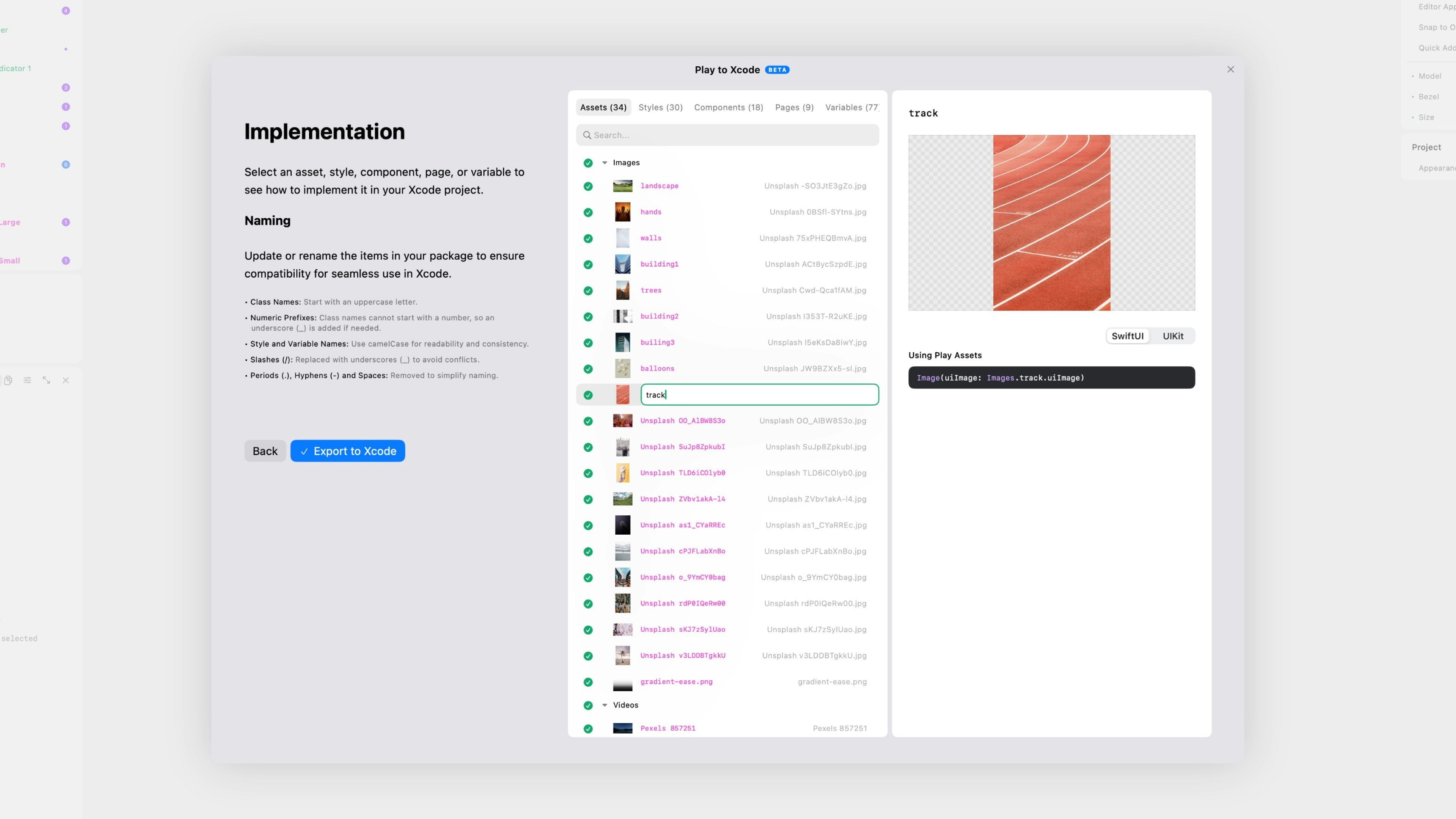 With Play to Xcode, your Play project is no longer just a prototype. You can use Play’s SDK (software development kit) to export your project’s styles, assets, components, pages, and variables directly into Xcode as a Swift package. Everything will look and behave 1:1 with how you designed it in Play. You can add the Swift package to a new or existing project in Xcode, and you can always update the package based on new changes in Play. We’re making it easy to keep your design tool and code base in sync.Note: Play to Xcode is only available on Pro & Enterprise plans.Components, pages, and variables each count as an “item” in the export. Assets and styles are included in the export and do not count as items.