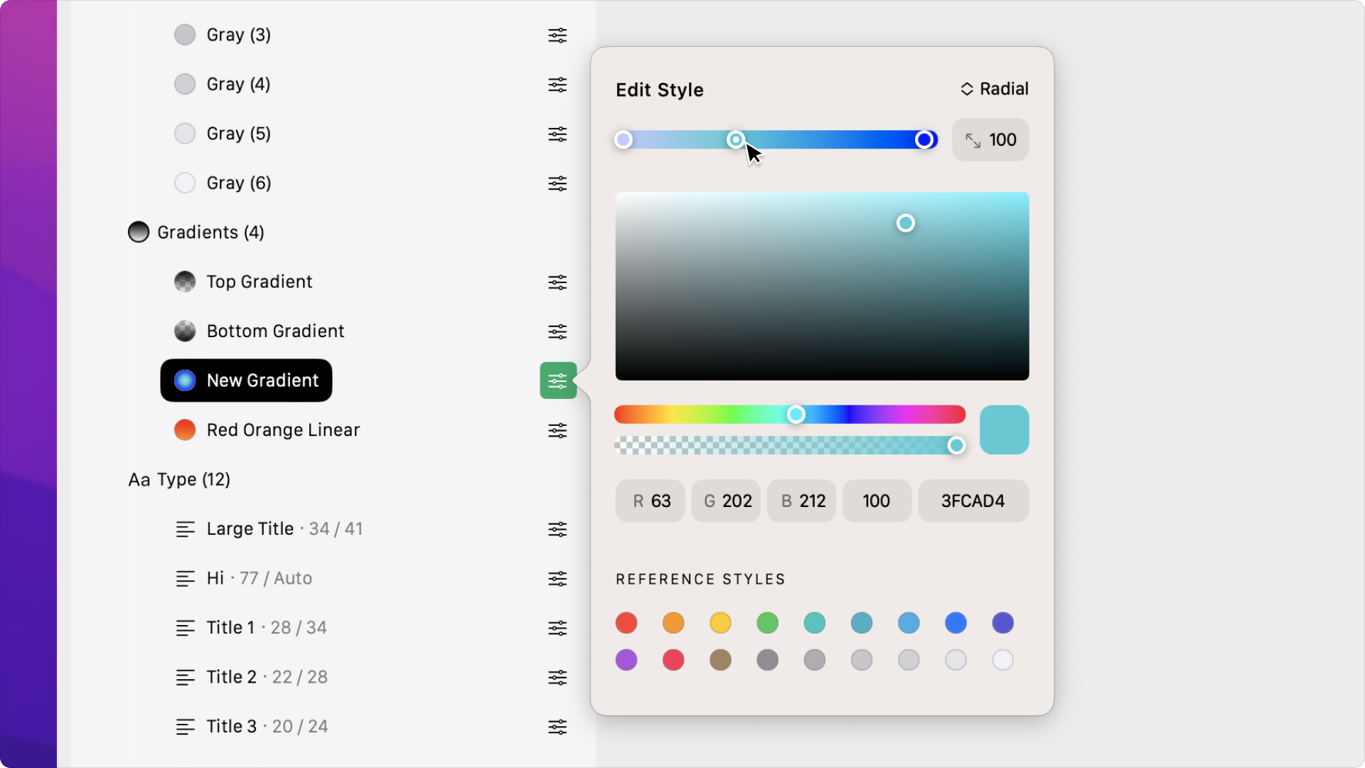 To create a Gradient style in macOS, click the plus icon in the Styles Panel. A new gradient will appear at the bottom of your Gradient styles list. To choose the gradient’s color values, click the edit icon on the row, then edit the gradient in the pop up.