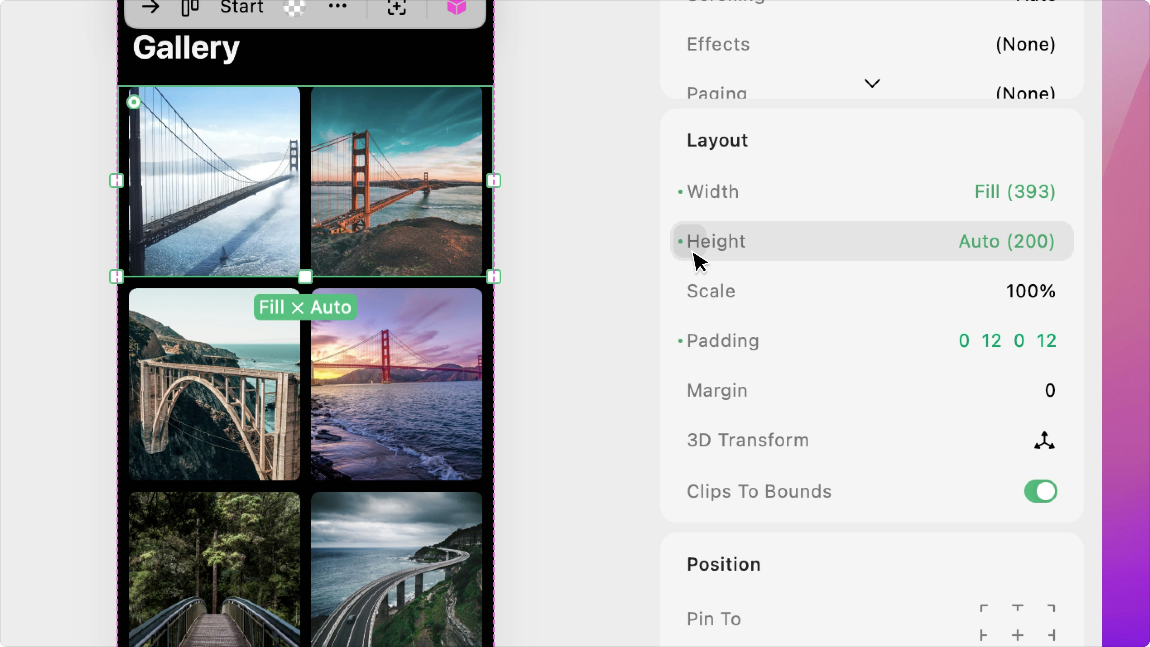 You can also set the width and/or height to “Fill.” This feature comes in handy when creating a layout where you want a certain object inside of a container to grow to fill the dimensions of that container.