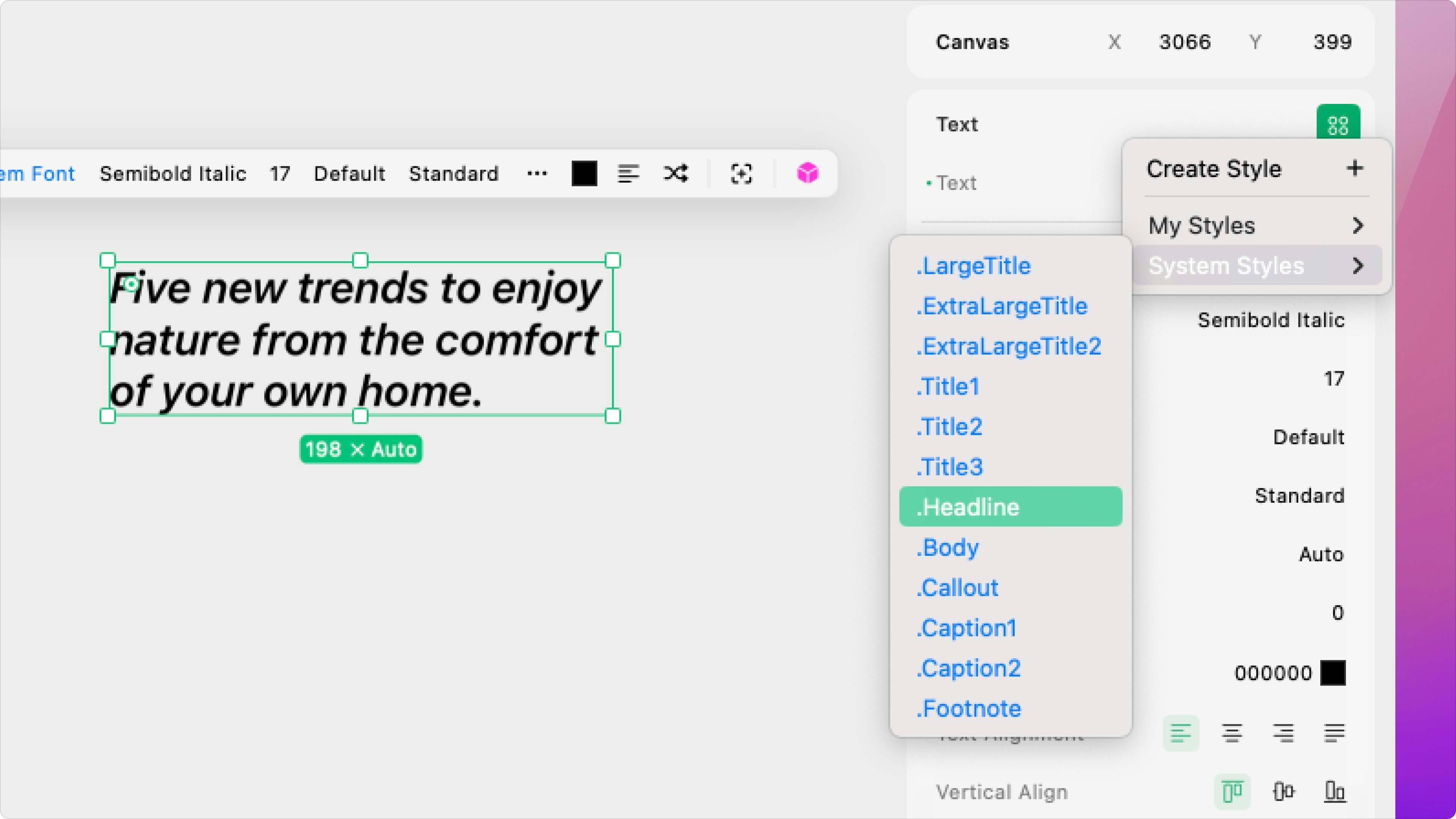 Select the font family for the text. Instead of selecting a font family, you can also select one of Apple’s System Styles or a custom Type style from the project by clicking on the four-circle icon.