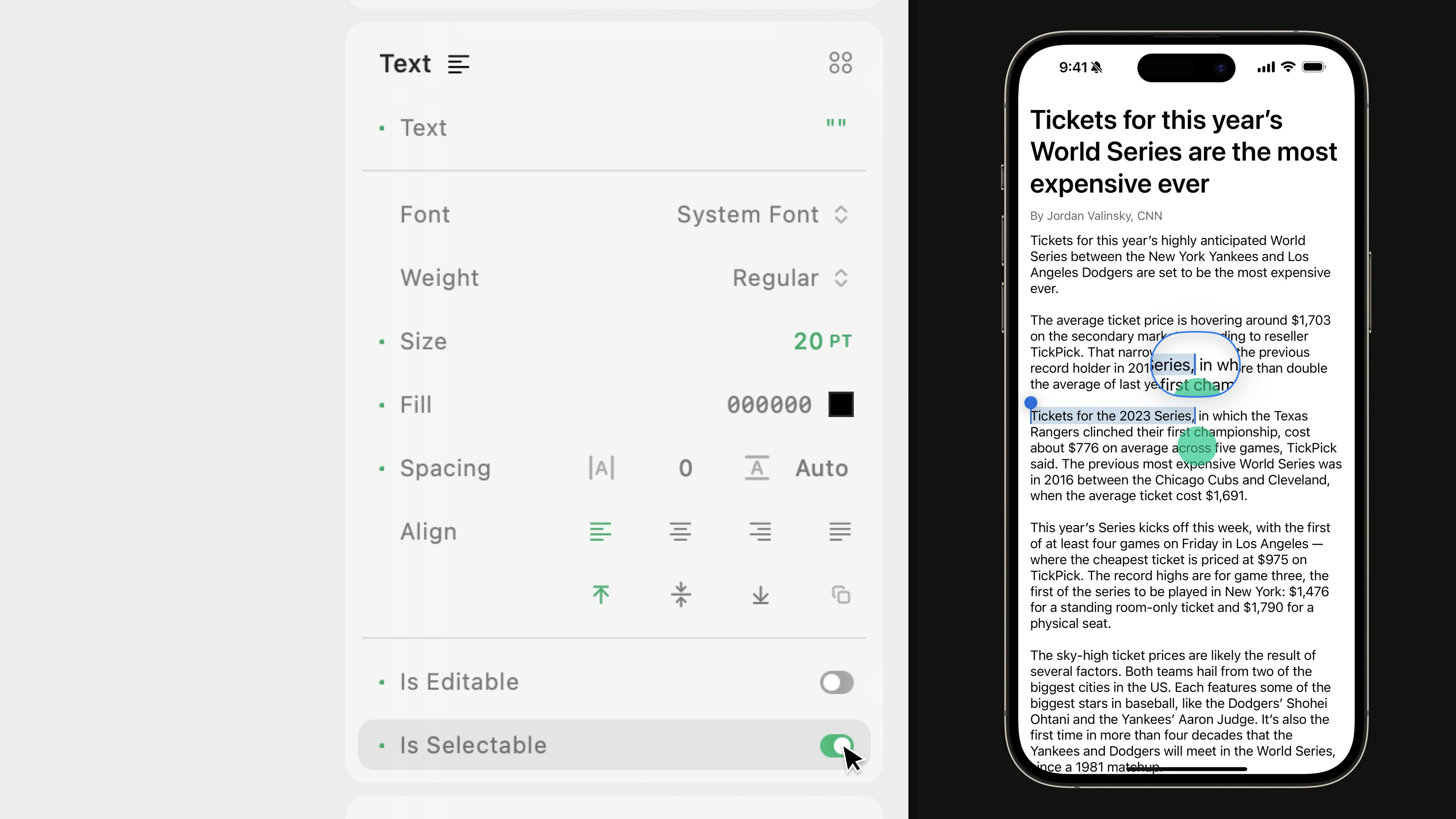 Choose if the text can be selected when a user double-taps it. The native edit menu will appear, allowing users to drag the selector and use the native options that appear, like Copy, Look Up, Translate, and more. All that functionality is built in and completely native.In Expression Editor
